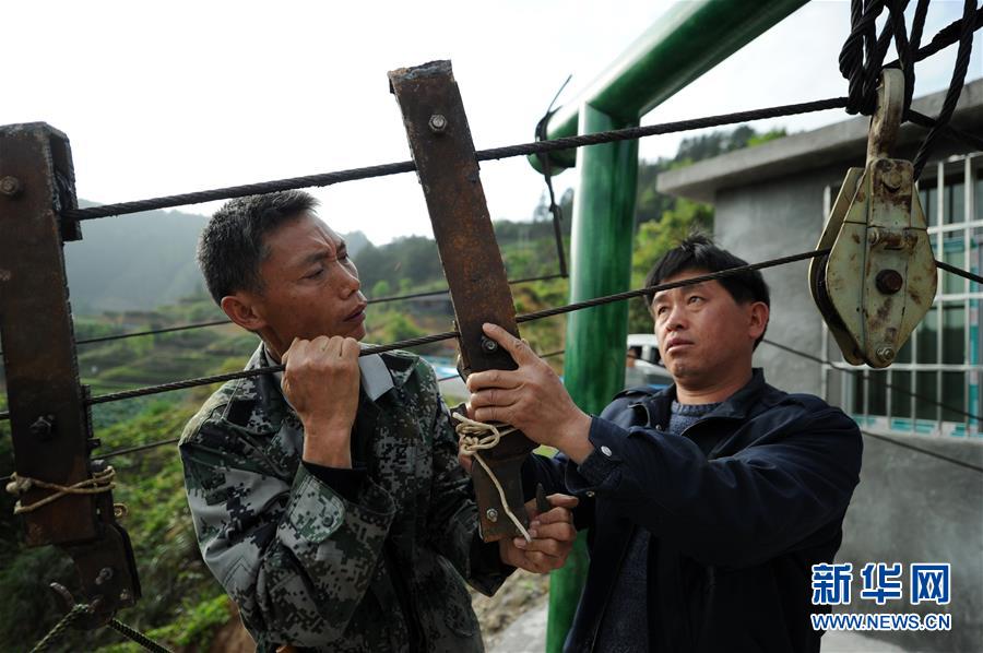 4月8日,排调镇党早村村民在检查索道挂钩的安全稳定情况。 新华社发(杨文斌 摄)