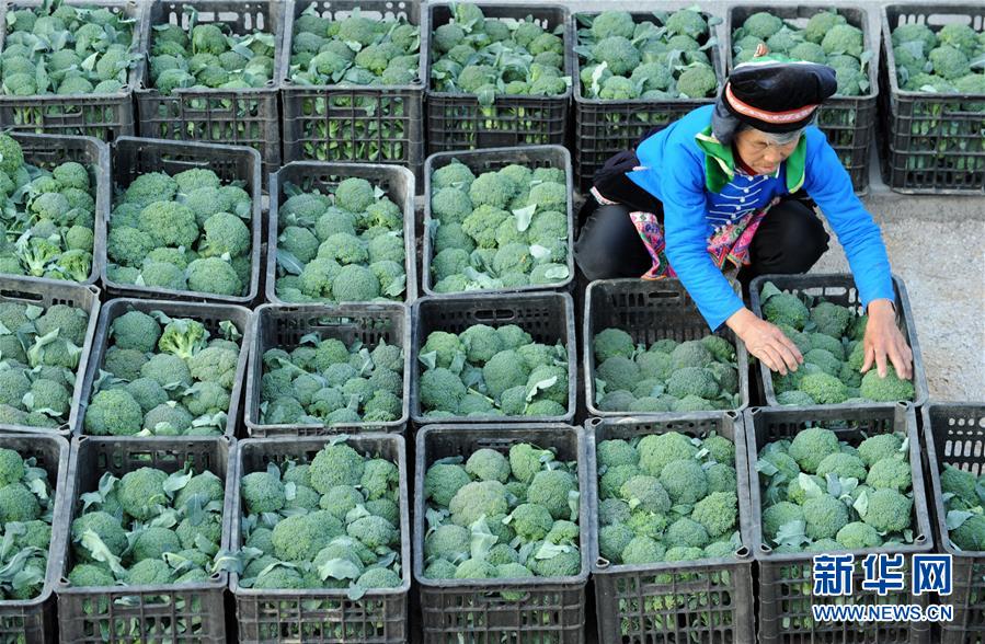 4月8日,排调镇党早村村民在整理利用索道运送到公路旁的西兰花。 新华社发(杨文斌 摄)