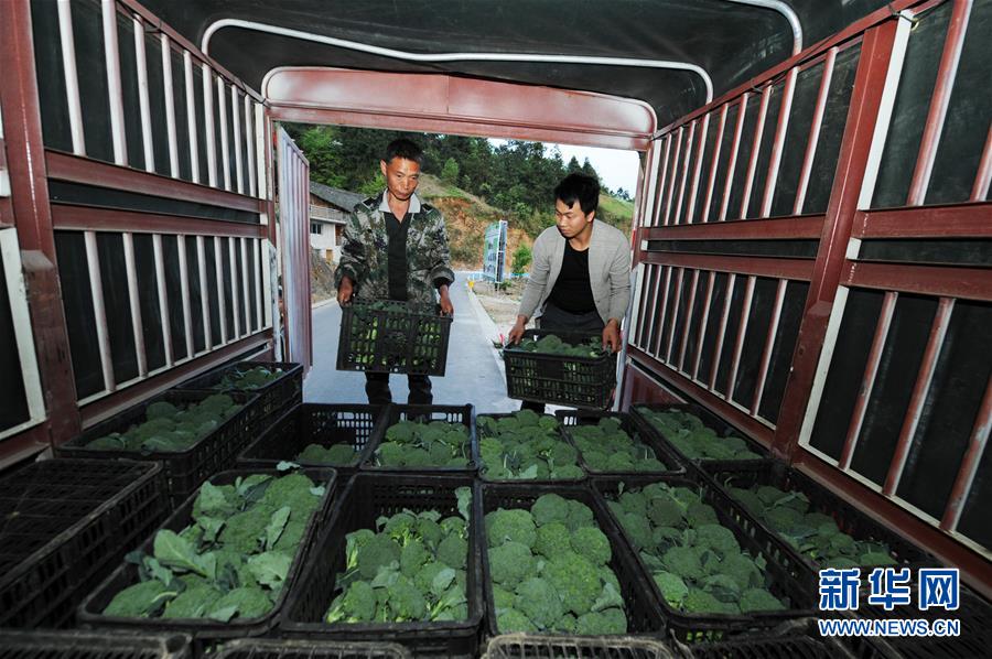 4月8日,排调镇党早村村民(左)与收购商(右)把利用索道运送到公路旁的西兰花搬上车。 新华社发(杨文斌 摄)