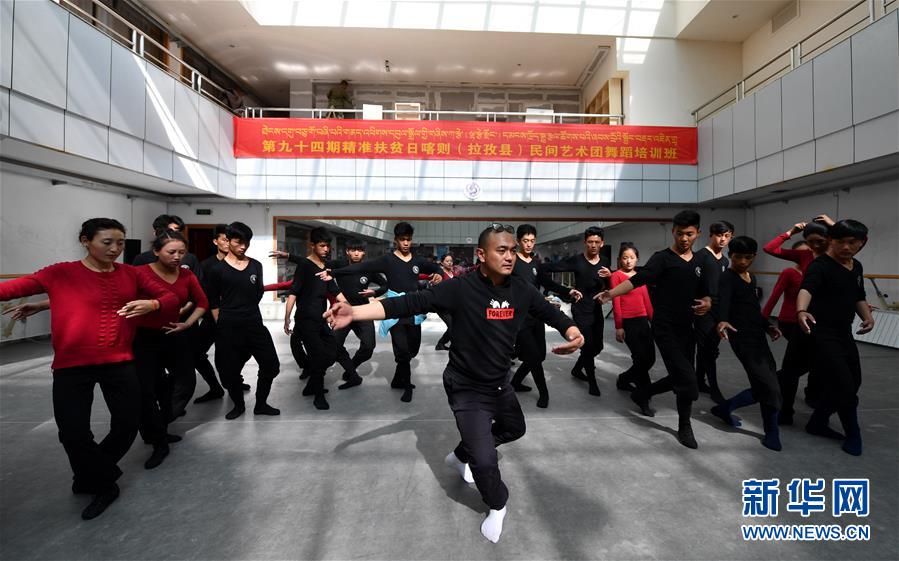 4月10日,西藏自治区群艺馆舞蹈老师普布扎西(前中)在给学员教授基本舞蹈动作。新华社记者 晋美多吉 摄