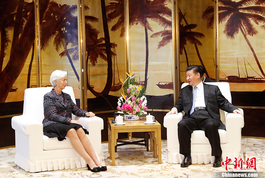 4月10日,中国国家主席习近平在海南省博鳌国宾馆会见国际货币基金组织总裁拉加德。 中新社记者 杜洋 摄