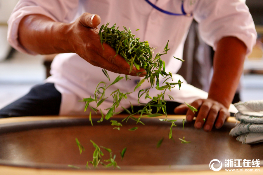 4月10日上午,第十三届中国新昌大佛龙井茶王大赛决赛在中国茶市举行,20名在预赛中胜出的选手现场较量手工炒茶技艺。