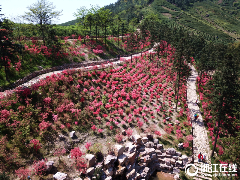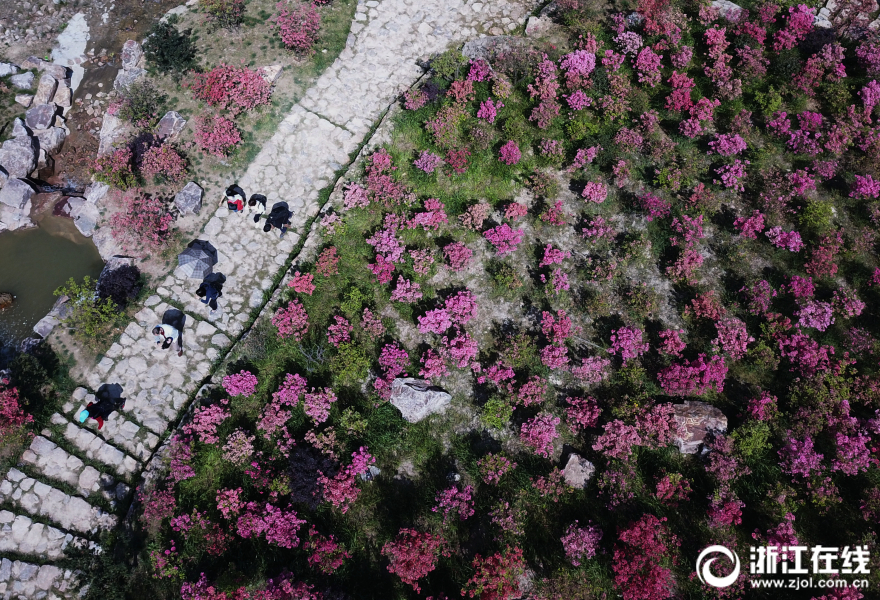 4月10日,浙江省湖州市长兴县和平镇城山沟景区内,上百亩映山红竞相开放,吸引不少游客赏花踏春。(拍友 杨晓霞 摄)