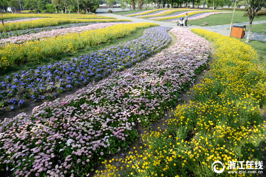 4月11日,杭州市萧山南江公园春风荡漾,姹紫嫣红,一条条鲜花绸带显示满园春色。(拍友 傅灿良 摄)
