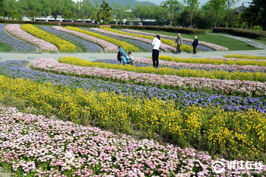 4月11日,杭州市萧山南江公园春风荡漾,姹紫嫣红,一条条鲜花绸带显示满园春色。(拍友 傅灿良 摄)