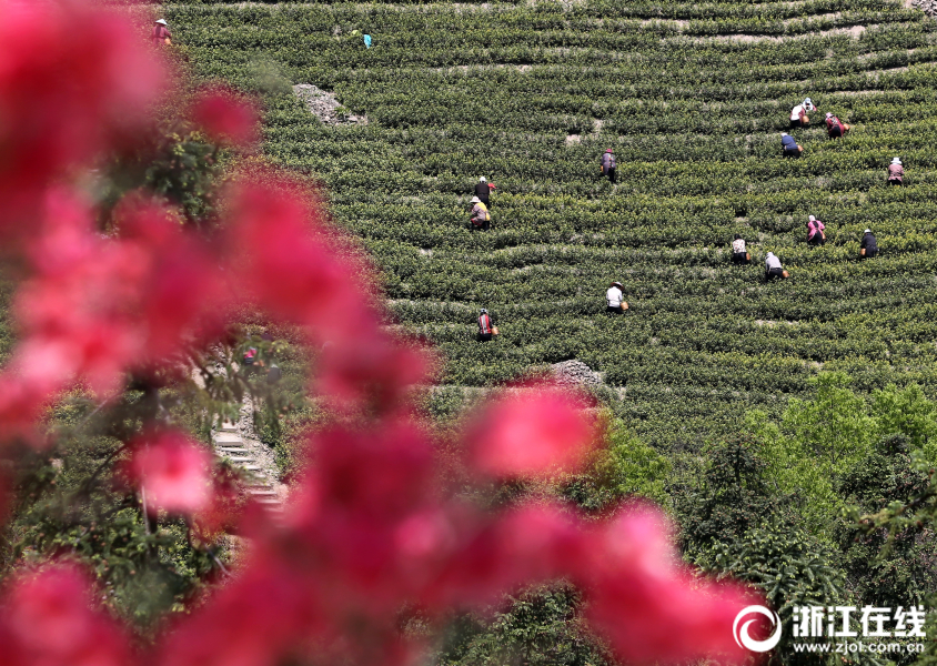 4月10日,湖州长兴县和平镇城山村的茶山上,采茶工们正在抓紧采摘春茶。(拍友 杨晓霞 摄)
