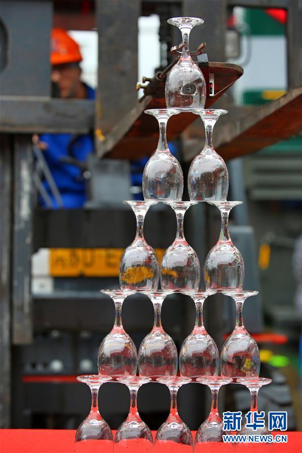 4月13日,一名工人表演用叉车叠杯子。 新华社发(陈暐 摄)