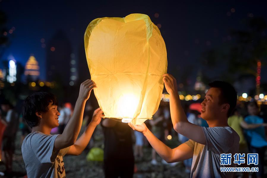 人们在活动现场放飞孔明灯(4月13日摄)。 4月13日,云南省西双版纳傣族自治州景洪市在澜沧江畔举办放飞孔明灯活动,欢庆傣历1380年新年。 新华社记者 胡超 摄