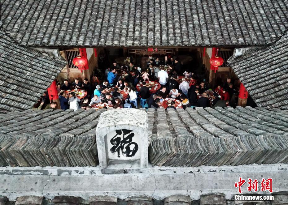 图为村民和游客在明清时期客家古民居里吃春耕宴。张斌 摄