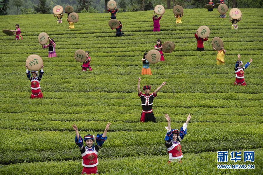 4月15日,当地农民在五峰县渔洋关镇青岗岭茶园为游客表演土家族采茶舞。新华社记者 杜华举 摄