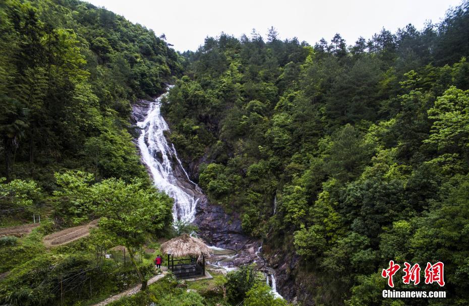 4月14日,航拍江西省上饶市铅山县太源畲族村,雨后的畲乡村庄山清水秀,百米瀑布飞流直下,与畲乡特色民居构成了一幅山水画。 丁铭华 摄