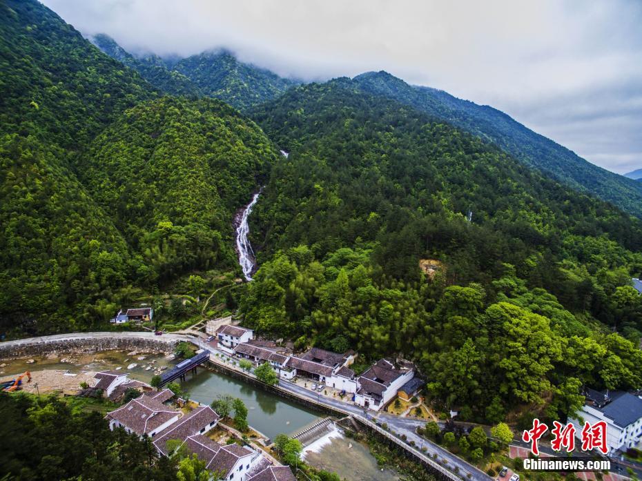 4月14日,航拍江西省上饶市铅山县太源畲族村,雨后的畲乡村庄山清水秀,百米瀑布飞流直下,与畲乡特色民居构成了一幅山水画。 丁铭华 摄