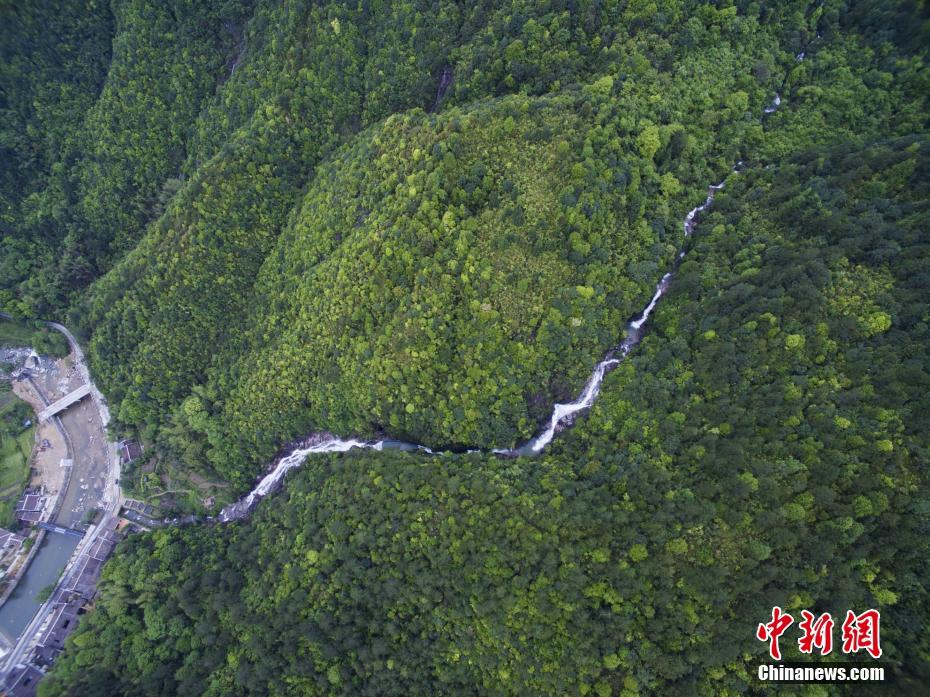 4月14日,航拍江西省上饶市铅山县太源畲族村,雨后的畲乡村庄山清水秀,百米瀑布飞流直下,与畲乡特色民居构成了一幅山水画。 丁铭华 摄