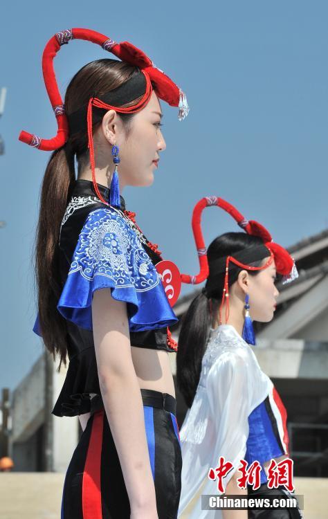 4月18日,模特们身着畲族特色的服饰走秀。当日,浙江景宁举办了一场以“视界畲乡”为主题的畲族服饰设计展演活动。中新社记者 张茵 摄