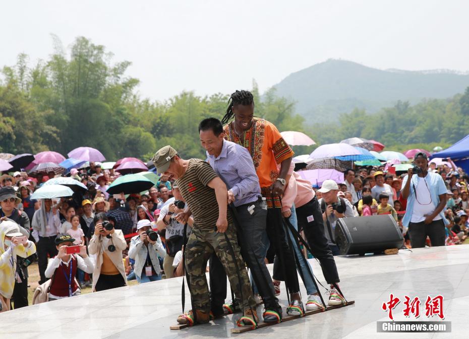 一名外国留学生(中)参加板鞋竞速比赛活动。曾开宏 摄