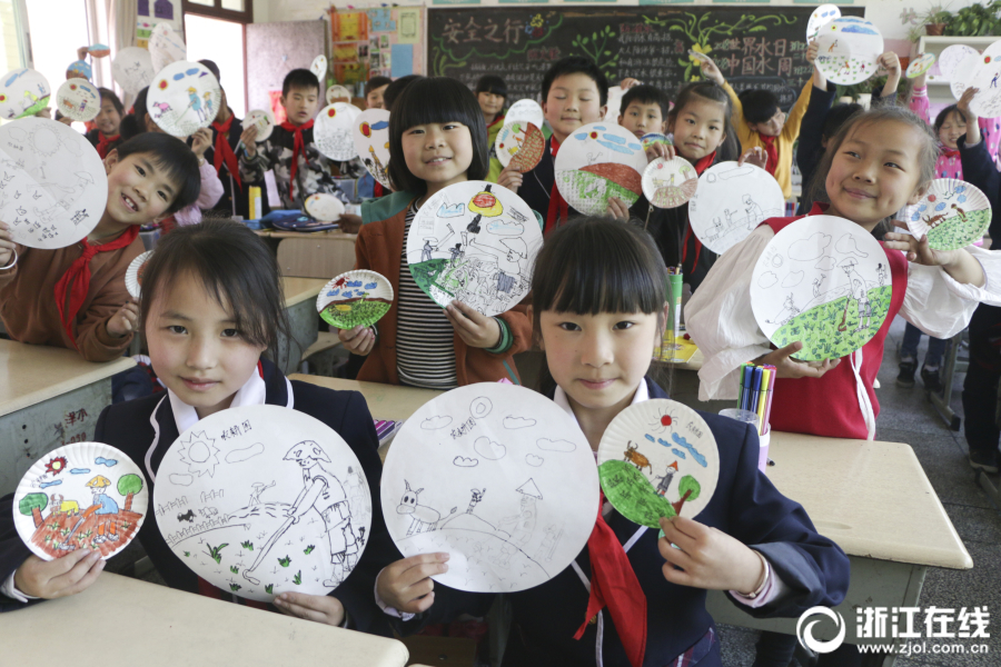 4月18日,桐庐县洋洲小学二年级学生在纸盘上描绘《农耕图》,迎接谷雨节气到来。(浙江在线拍友 徐军勇 摄)