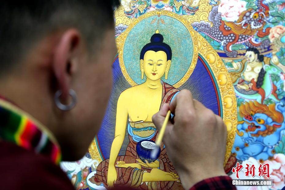 4月18日,唐卡画师现场绘画唐卡《释迦牟尼与十八罗汉》。当日,青海省首届劳模(职工)技术创新成果展示会在青海省美术馆开幕,来自该省黄南藏族自治州的热贡地区的唐卡画师现场为参展观众展现“指尖”传承。唐卡系藏文音译,多画于棉布上,是用绸缎缝制装裱的宗教卷轴画。如今,青海省唐卡绘画日益繁荣,该省黄南藏族自治州的热贡地区,唐卡色彩鲜丽,从艺人员众多,绘画技法精妙,被誉为“藏画之乡”。 中新社记者 孙睿 摄