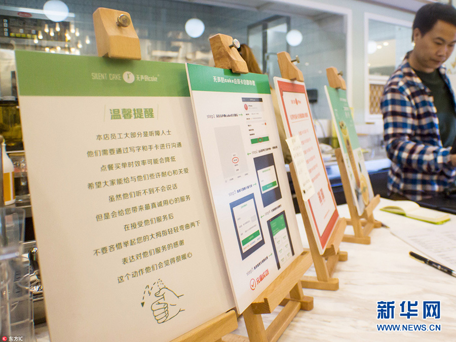 在店铺内摆放温馨提示,本店大部分员工是听障人士,顾客需要透过文字和手卡进行沟通。图片来源:东方IC