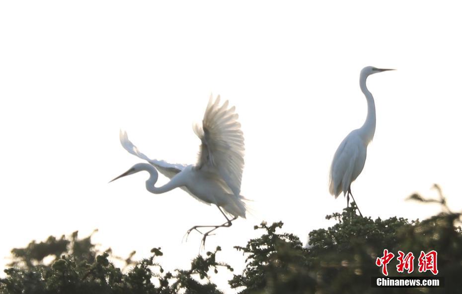 成群的鹭鸟或栖息在树上,或在林中穿插而过。 刘占昆 摄