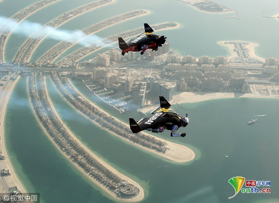 当地时间2015年5月12日,迪拜,素有“空中飞人”之称的瑞士人伊夫斯-罗西(Yves Rossy)与法国极限跳伞选手文斯-利弗特(Vince Reffet)日前身穿火箭飞行器(jetpacks),像漫画里的超级英雄那样组成完美编队,从迪拜上空飞过。图为从一架水上飞机上拍摄的景象。
