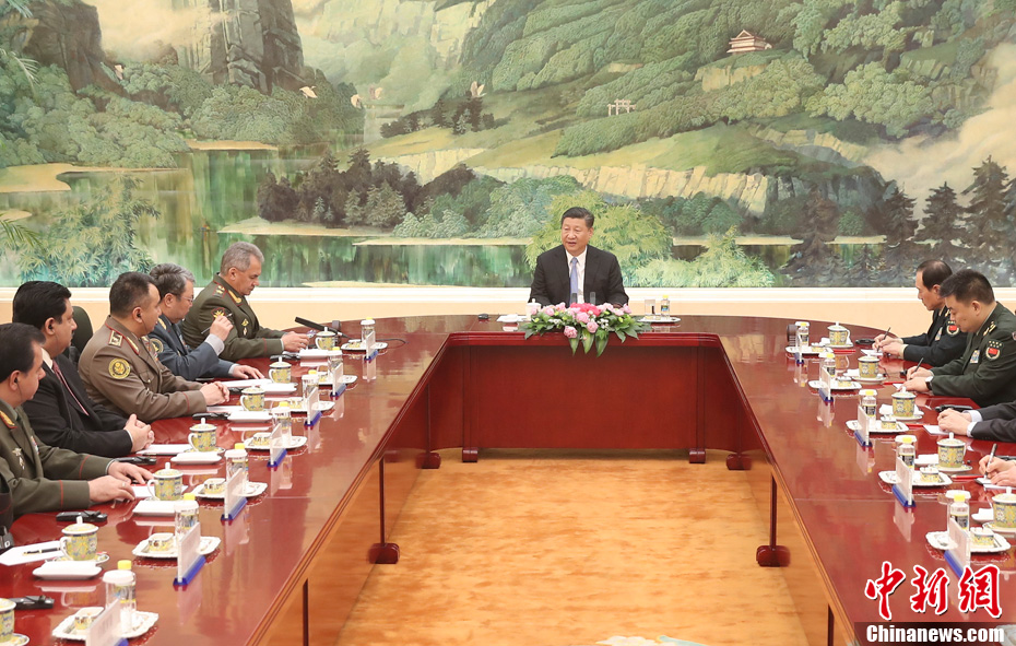4月23日,中国国家主席习近平在北京人民大会堂集体会见上海合作组织成员国国防部长。俄罗斯国防部长绍伊古、哈萨克斯坦国防部长扎苏扎科夫、吉尔吉斯共和国武装力量总参谋长杜伊申比耶夫、巴基斯坦国防部长达斯特吉尔·汗、塔吉克斯坦国防部长米尔佐、乌兹别克斯坦国防部长阿济佐夫,上海合作组织副秘书长索韦托维奇,上海合作组织地区反恐怖机构执行委员会副主任吉约索夫、印度驻华大使班浩然以及作为特邀嘉宾列席此次会议的白俄罗斯国防部长拉夫科夫参加会见。中新社记者 盛佳鹏 摄