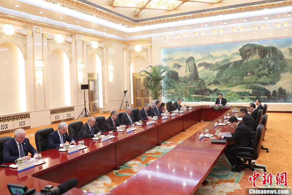 4月23日,中国国家主席习近平在北京人民大会堂集体会见来华出席上海合作组织成员国外长理事会会议的俄罗斯外长拉夫罗夫、印度外长斯瓦拉杰、哈萨克斯坦外长阿布德拉赫曼诺夫、吉尔吉斯斯坦外长阿布德尔达耶夫、巴基斯坦外长阿西夫、塔吉克斯坦外长阿斯洛夫、乌兹别克斯坦外长卡米洛夫、上海合作组织秘书长阿利莫夫、上海合作组织地区反恐怖机构执委会主任瑟索耶夫。中新社记者 盛佳鹏 摄