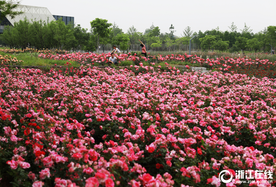 4月23日,市民在义乌月季园内赏花健身。月季是义乌的市花,被称为花中皇后,眼下正是月季花开的季节,走在义乌的大街小巷,处处花香四溢、姹紫嫣红。(浙江在线拍友 龚献明 摄)