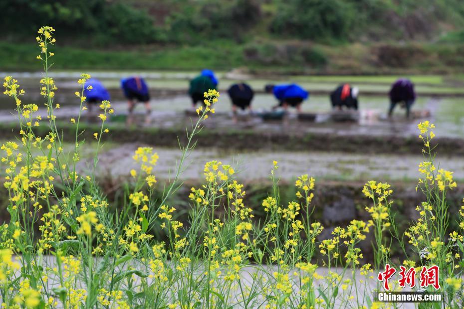 4月24日,贵州省丹寨县城望苗寨,民众在田间劳作。谷雨节气刚过,贵州省丹寨县民众抢抓农时,耕田、栽插。这里的秧田多在山间,当地特色农产品受到全国各地市场青睐。 中新社记者 贺俊怡 摄