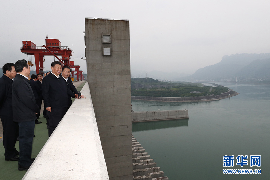 4月24日下午,中共中央总书记、国家主席、中央军委主席习近平来到三峡大坝,详细了解三峡工程建设、发电、水利、通航、生态保护等方面的情况。这是习近平在坝顶察看三峡工程全貌和坝区周边生态环境。新华社记者 鞠鹏 摄