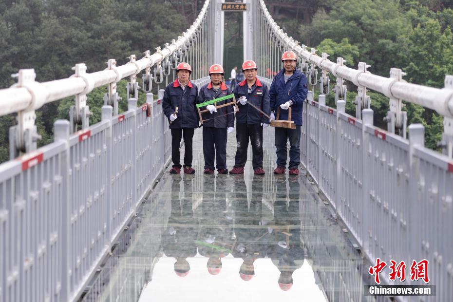 修理工手持工具在玻璃桥上合影。 杨华峰 摄