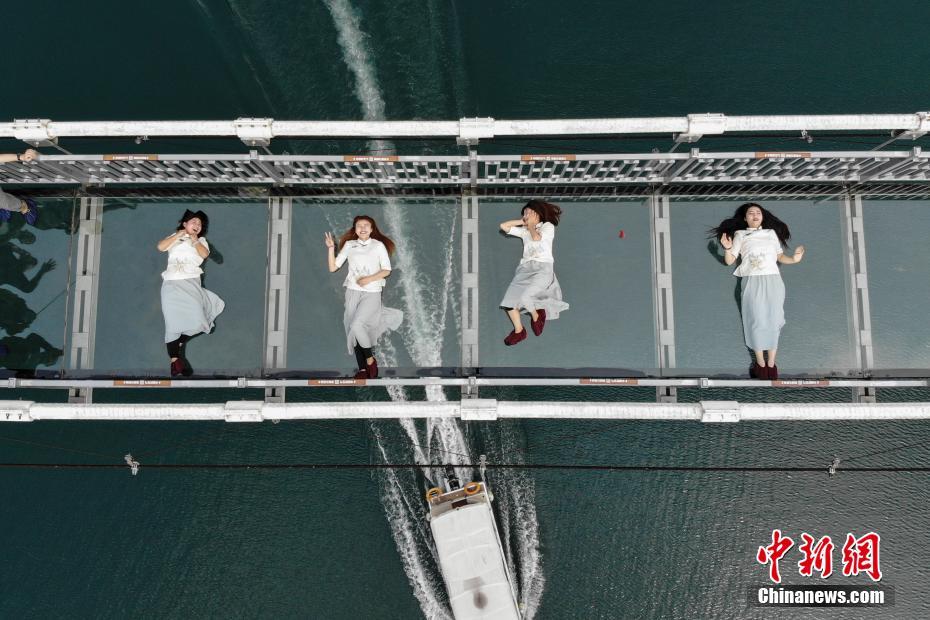 餐厅服务员在玻璃桥上创意拍照留念。 杨华峰 摄
