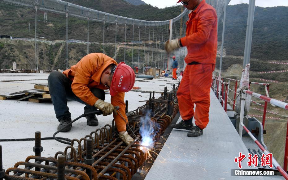 4月27日,四川泸定兴康特大桥施工现场,工人师傅们正在进行焊接作业。 中新社记者 刘忠俊 摄