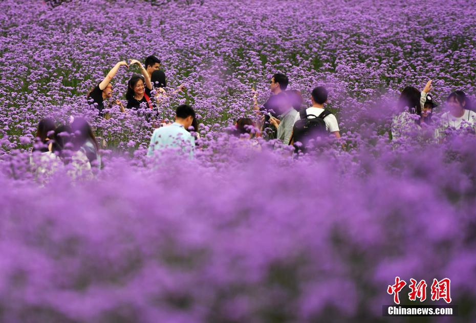游客在盛开的柳叶马鞭草花海中边赏花边拍照留念。张斌 摄