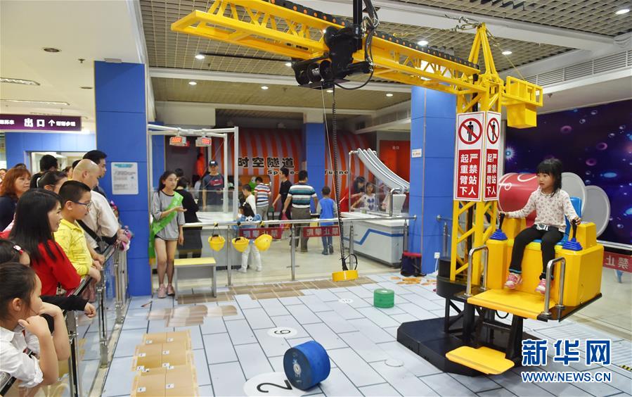 4月29日,在福建省科技馆,小朋友在建筑师体验环节操控“起重机”。当日是“五一”小长假第一天,人们以各种方式放松心情,欢度假期。 新华社记者 宋为伟 摄