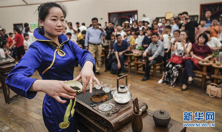 4月29日,游客在河南信阳南湾湖风景区观赏传统茶艺表演。当日是“五一”小长假第一天,人们以各种方式放松心情,欢度假期。 新华社记者 陶明 摄