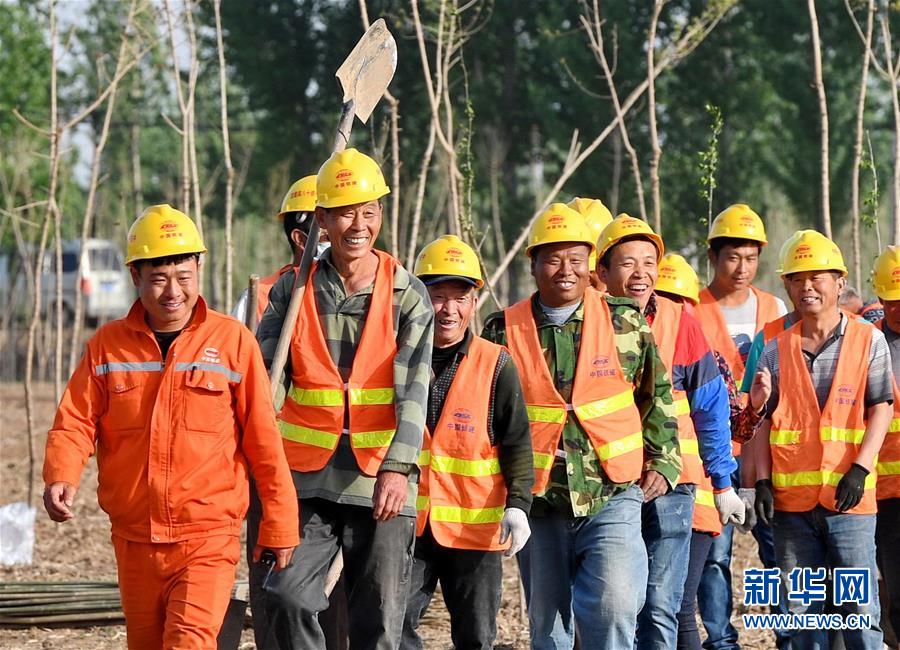 这是4月27日在雄安新区“千年秀林”施工现场拍摄的植树工人。在“千年秀林”施工现场,数以千计的植树工人们,用锨镐的叮叮当当,谱写出造林的交响曲。曾在黄土里摸爬滚打的当地农民成为造林的主力军,为“雄安绿、新区蓝”添枝加叶。一锹一铲,一俯一仰,秀林建设者以朴实的方式,表达着对新区的憧憬、对未来的向往。他们滴落下的汗水,浸润了脚板下的土地,也渐渐染绿我们的视野;清晨时的奋斗,催开了黄昏时的笑容,也终将成为幸福的源泉。 新华社记者 牟宇 摄