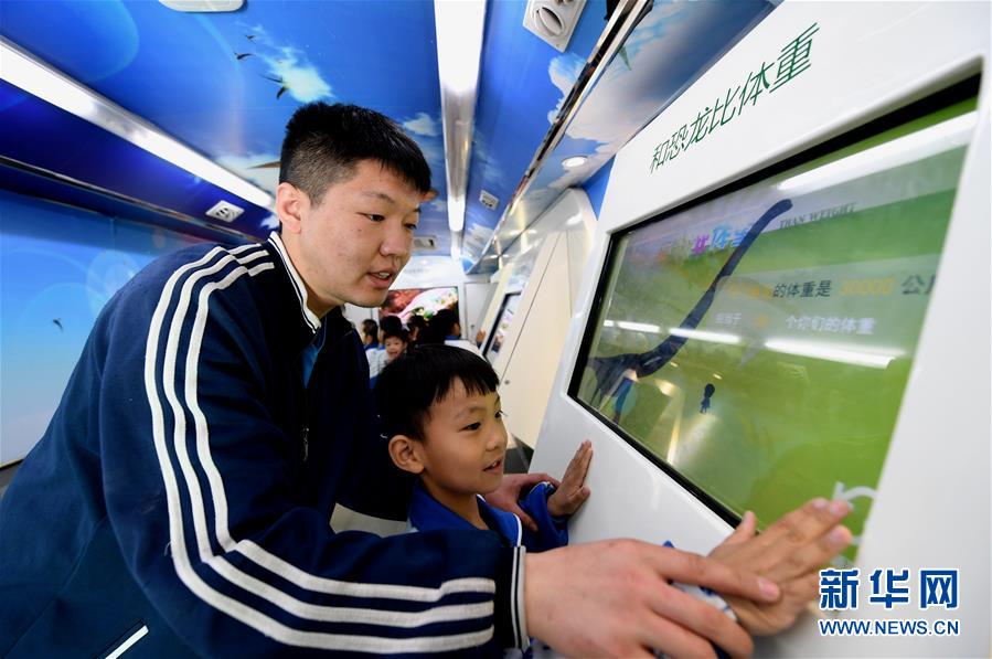 4月27日,北京自然博物馆工作人员王宇(左)在流动科普车上指导小学生体验互动设备。今年28岁的王宇是北京自然博物馆的工作人员,他和同事们日前来到中关村第三小学雄安校区,通过知识展板、多媒体演示、恐龙化石标本展示等方式,开展为期7天的科普展。王宇说,希望自己的努力能使孩子们的视野更加开阔,课余生活更加丰富。 新华社记者 杨世尧 摄