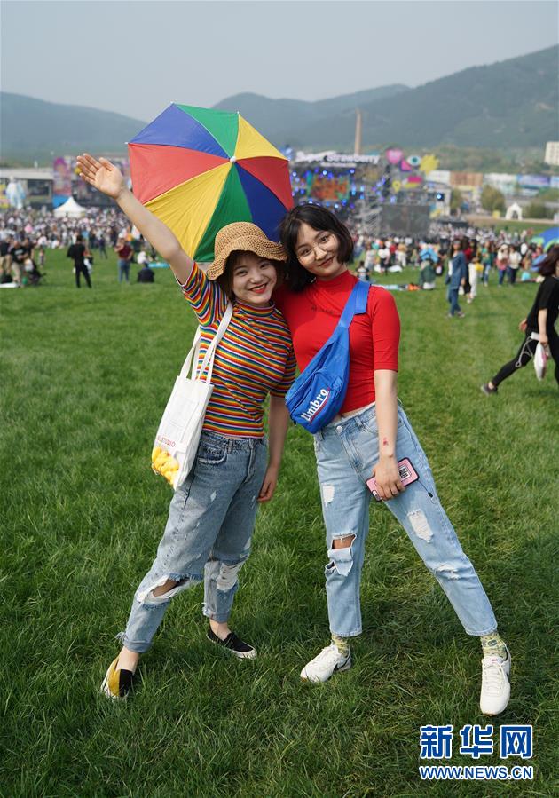 4月29日,音乐爱好者在北京渔阳国际滑雪场举行的2018乐谷·北京超级草莓音乐节上合影。当日是“五一”小长假第一天,人们以各种方式放松心情,欢度假期。 新华社记者 才扬 摄