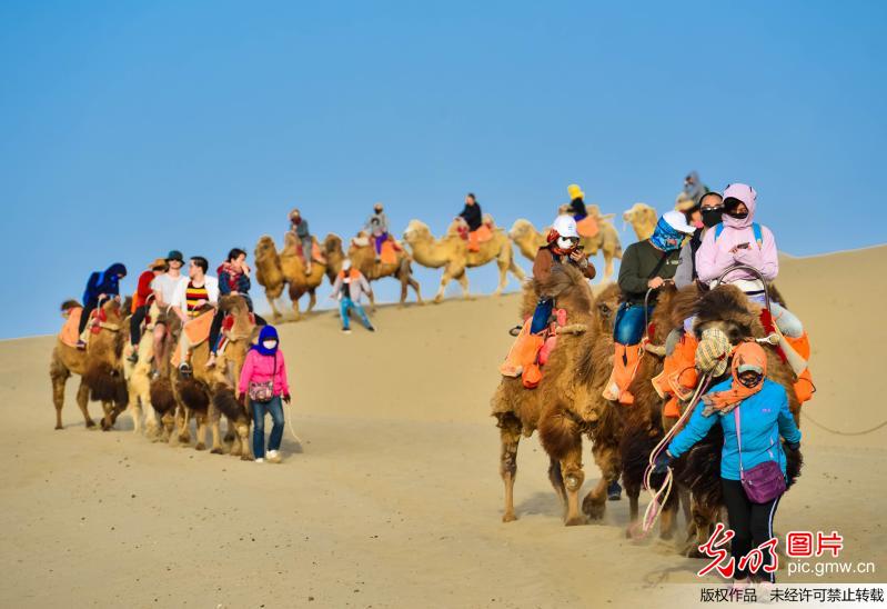 2018年4月29日,游客骑骆驼畅游鸣沙山,体验丝路风情。