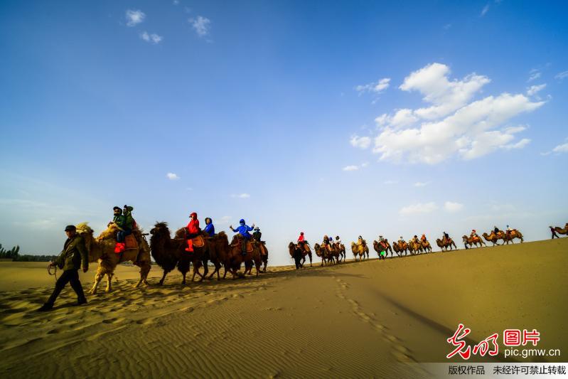 2018年4月29日,游客骑骆驼畅游鸣沙山,体验丝路风情。