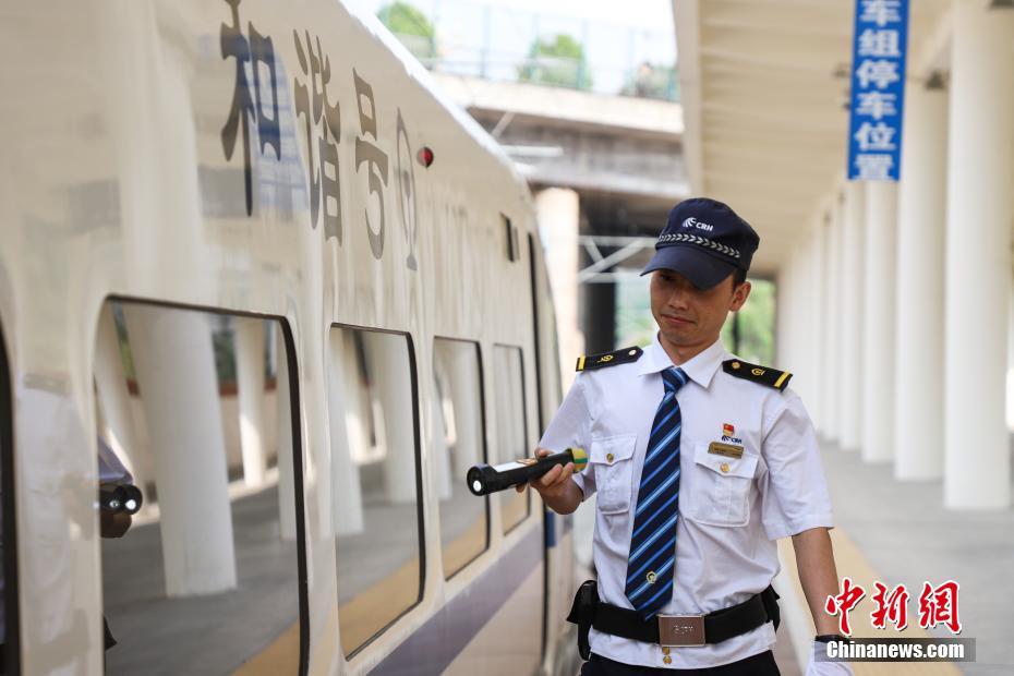 4月30日,“五一”劳动节期间,贵阳北动车运用所90后动车组随车机械师王多维凌晨3:30就已开始一天的工作。从出发前的始发作业:车端检查、车体检查、高压设备检查到行驶途中的巡查作业:司机室检查、客室检查、监控查询。他在作业过程中不放过每一个细节,认真检查自己值乘的车组,及时排除故障,确保节日期间动车安全运行。图为进站后王多维对动车进行巡检。中新社记者 瞿宏伦 摄