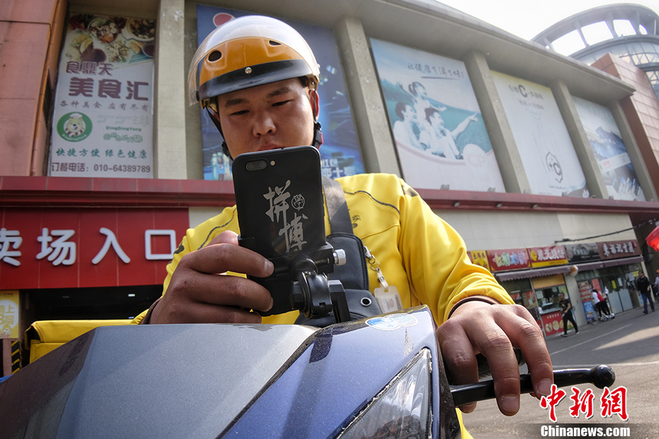 曾经,叫份外卖是一种应急措施,现在这种生活模式已经成了戒不掉的习惯。朱飞鹏是酒仙桥地区的一名外卖送餐员,说话时脸上一直带着腼腆礼貌的微笑,“其实也不是很累,送餐也是为人民服务。”中新网记者 李霈韵 摄