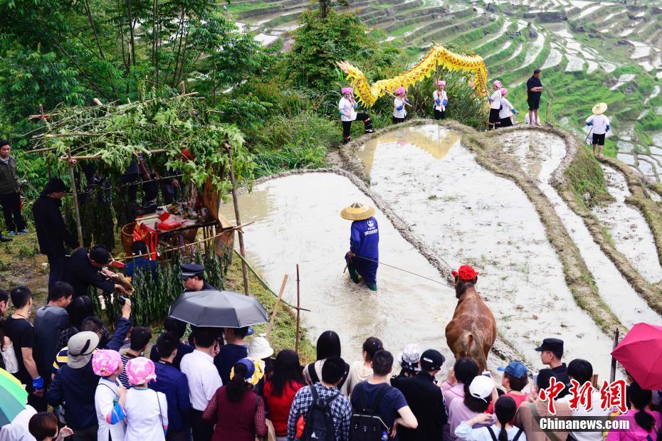 “五一”小长假期间,广西龙胜各族自治县龙脊古壮寨举办传统农事活动—— “开耕节”,当地壮族同胞按照传统习俗,开展舞龙擂鼓庆开耕、供田仪式、偶耕展示、爬梯田做好汉、梯田捉风鸡翠鸭等丰富多彩的民俗活动,祈求新的一年风调雨顺、国泰民安、五谷丰登,活动吸引众多中外游客前来参观体验。“开耕节”的到来标志着龙脊梯田开始放水灌田,一年春耕开始。图为当地壮族群众在进行供田开耕仪式。中新社记者 吴生斌 摄