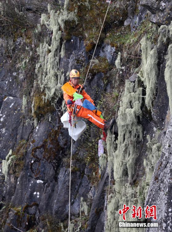 5月1日,四川峨眉山,乐山山地救援队队长王麒正在清理峨眉山金顶崖壁上的垃圾。中新社记者 刘忠俊 摄