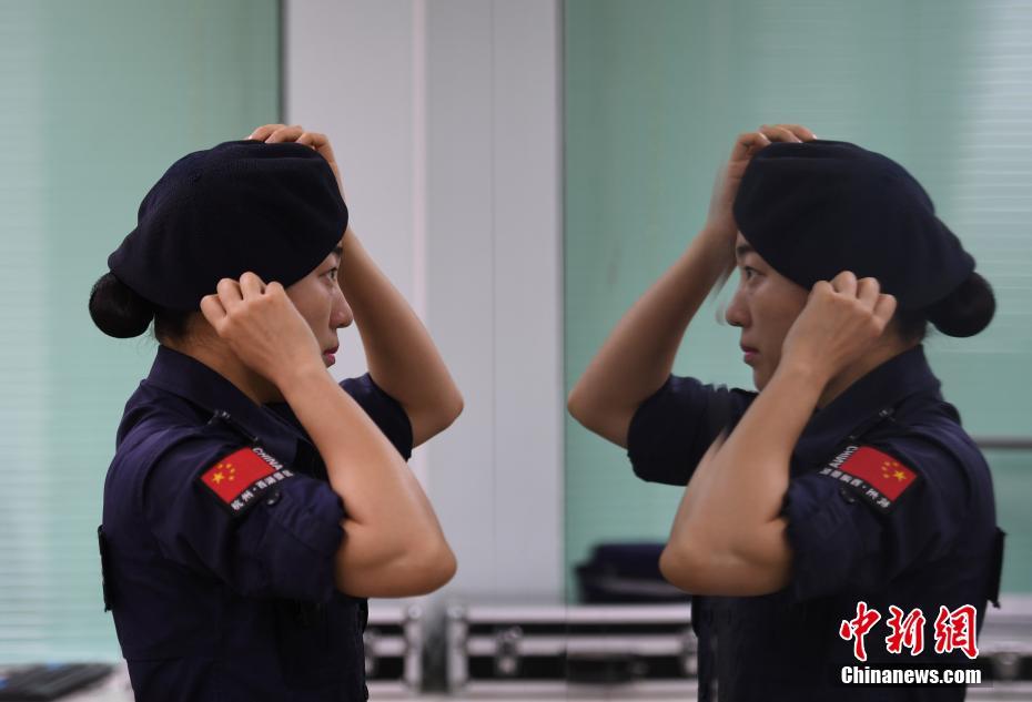 西湖女子巡逻队队员正在镜子前整理妆容。 中新社记者 王刚 摄