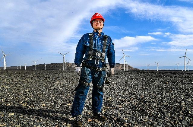 王美乐站在位于三十里风区的白杨河风电场内(4月20日摄)。新华社记者 王菲 摄