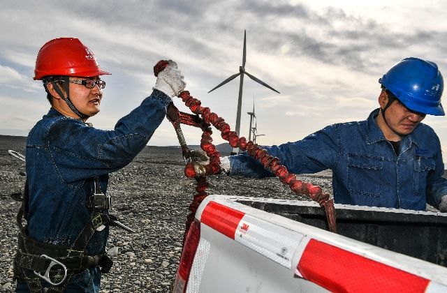 在位于三十里风区的白杨河风电场内,王美乐(左)和同事正在准备检查设备运转情况(4月20日摄)。新华社记者 王菲 摄