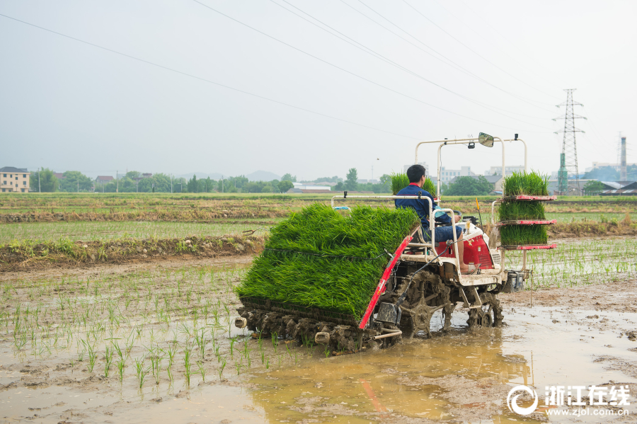 5月2日下午,桐庐县江南镇莲塘村,农户在粮食功能区内驾驶着插秧机,拉开了今年机插早稻的序幕。近年来,桐庐县不断加大水稻机插推广力度,通过几年试验示范,越来越多的农户青睐这种省工省时的栽秧新方法。(浙江在线拍友 单佳铭 徐军勇 摄)