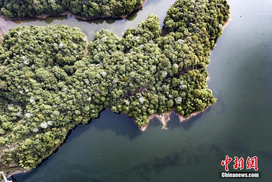 5月2日,航拍江西省宜丰县芳溪镇大丰水库旁的野生泡桐林。临近夏季,该县大片泡桐花陆续绽放,雪片般点缀在绿树丛中,格外赏心悦目。罗霄 摄