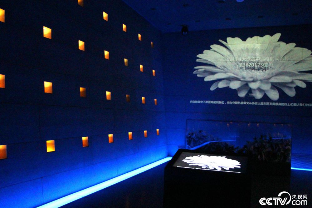 “5·12”汶川特大地震纪念馆,参观者在电子屏幕前点击按钮向地震遇难同胞献花祭奠。